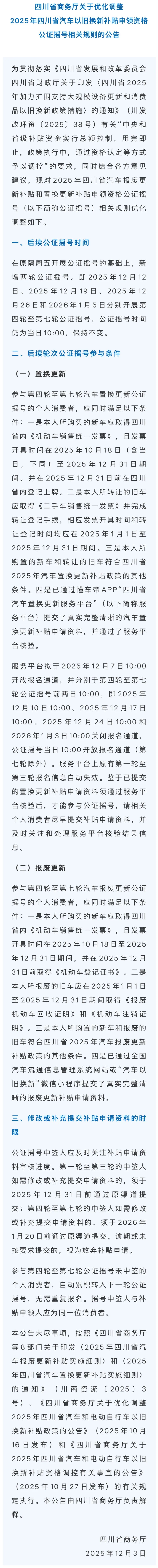12月3日晚间,四川省商务厅发布关于优化调整2025年四川省汽车以旧换新补贴申领资格公证摇号相关规则的公告,就后续公证摇号时间、后续轮次公证摇号参与条件、修改或补充提交补贴申请资料的时限进行了详细的说明。
